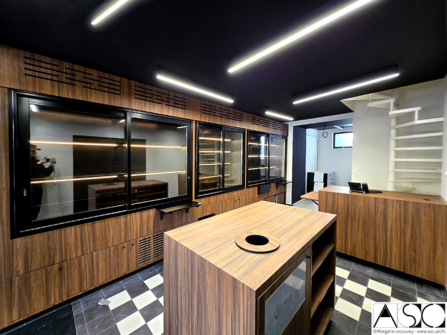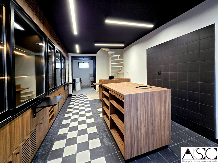 Chaque zone a été pensée selon les flux de clientèle et de production : la table de découpe centrale devient l’élément pivot du magasin, facilitant la circulation autour du meuble caisse et offrant une visibilité complète sur les produits exposés. Les matériaux choisis allient hygiène, durabilité et esthétique, pour un espace à la fois fonctionnel et chaleureux. L’éclairage, élément clé du projet, a été conçu comme un outil de mise en valeur : intensité maîtrisée, ambiances différenciées entre plan de travail et espace de vente.