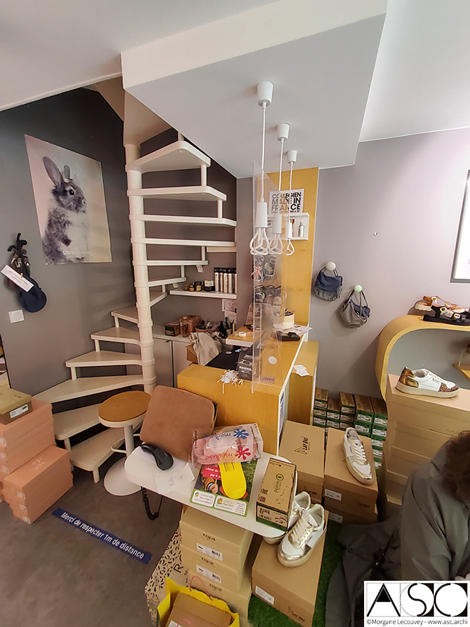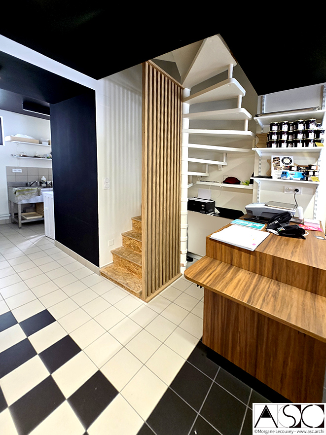 L’immeuble comprend trois niveaux : le rez-de-chaussée dédié à la fromagerie, et deux étages supérieurs intégrant le logement en duplex. L’accès au logement s’effectue par un escalier hélicoïdal existant, partiellement modifié et dissimulé côté boutique pour préserver la confidentialité tout en optimisant les circulations. Ce travail de connexion entre les usages professionnels et résidentiels s’inscrit dans la logique d’une réhabilitation globale, durable et cohérente.