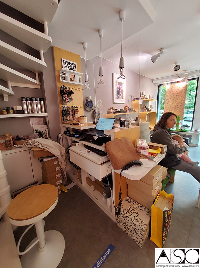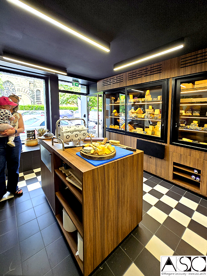 La réhabilitation du local a nécessité une réflexion technique approfondie autour du froid, des vitrines réfrigérées, et des contraintes liées à la chaîne du frais. En rez-de-chaussée, la nouvelle fromagerie propose un espace de vente lumineux, conçu pour répondre aux usages d’un commerce de proximité moderne tout en valorisant l’artisanat fromager. L’aménagement intègre des vitrines murales réfrigérées, une table à découpe centrale et un espace de préparation en fond de boutique, garantissant fluidité et ergonomie dans les parcours clients et vendeurs.